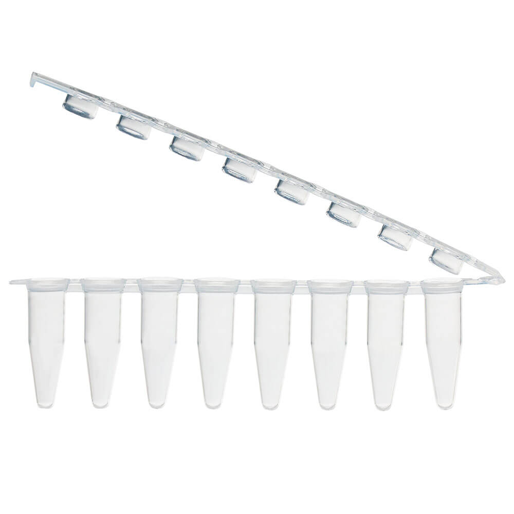 0.2mL 8-Strip Tubes, with Hinged Attached 8-Strip Clear Flat Caps, Natural