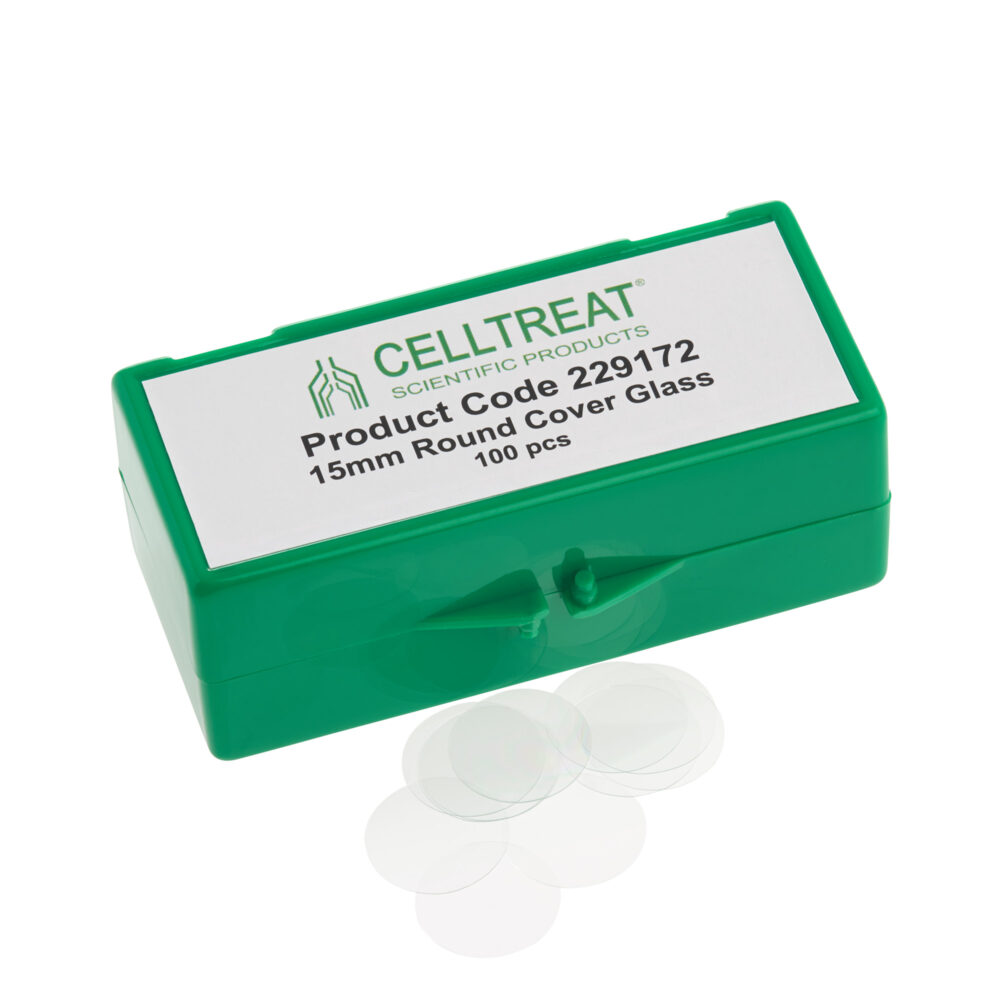 High-quality, optically clear borosilicate glass cover slips are ideal for specialty microscopy and imaging Ideal for use with dishes and multiple well plates and anywhere a square cover glass is unsuitable Consistent flatness and scratch-free Resistant to organic solvents Packaged in a hinged plastic storage case 15mm Round Cover Glass can be used with a 24 well glass bottom plate (Part No. 229125) Cover Glass is #1.5 thickness