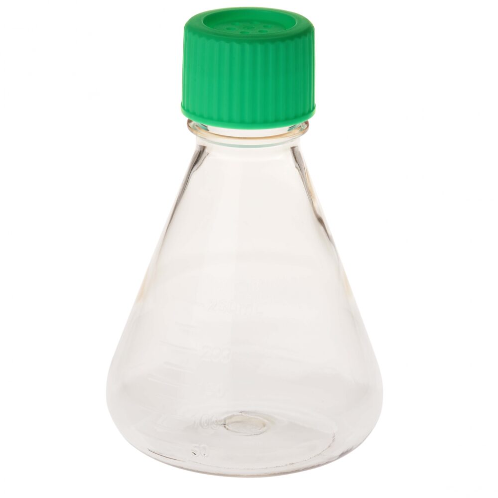 Designed for mammalian suspension culture applications as well as bacterial & yeast culture Vent with over-sized vent area feature 0.22µm hydrophobic membrane which allows for improved gas exchange without contamination Avoid contamination with single-use, pre-sterilized flasks Lightweight material is easier to handle than glass Flasks include molded graduation lines Individually bagged for easy storage and handling Medical grade virgin Polycarbonate is autoclavable