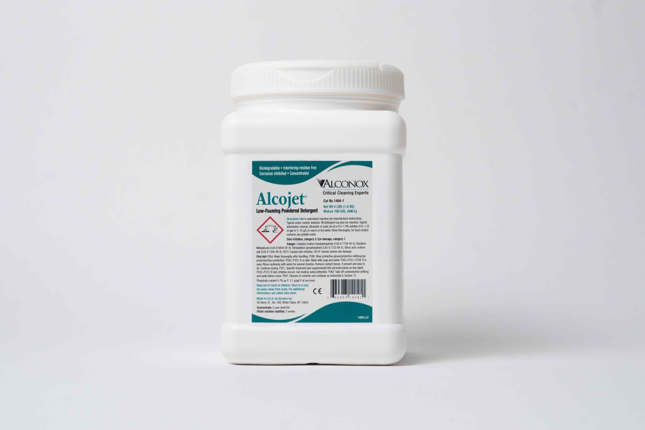 Alcojet – Low Foaming Powdered Detergent: Nonionic, low foaming powder cleaner for use in labware washers, parts washers, power-spray systems, manual and ultrasonic cleaning. Corrosion inhibited formula recommended for glassware, metals, plastic, ceramic, porcelain, rubber and fiberglass. Free rinsing for reliable results and no interfering residues. USDA authorized. Dilute 1:200. pH 11.5.