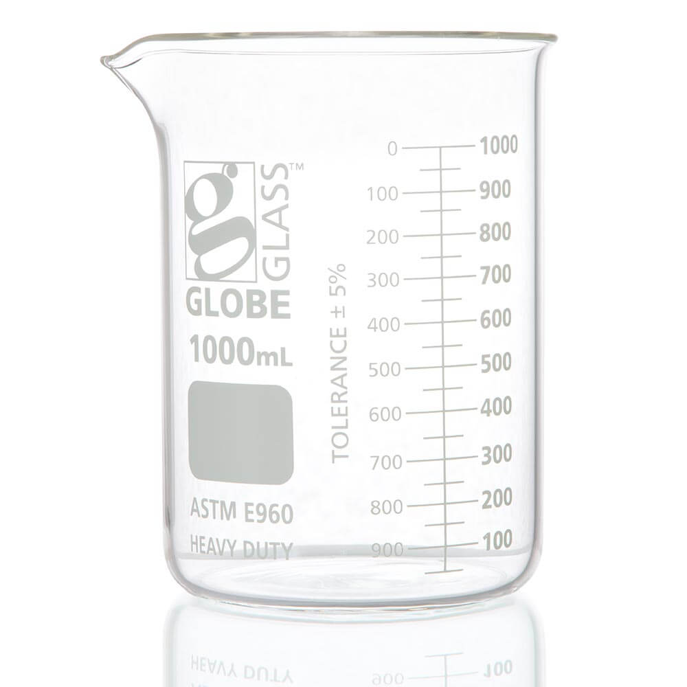 Beaker, Globe Glass, 1000mL, Low Form Griffin Style, Heavy Duty, Dual Graduations, ASTM E960, 6/Box