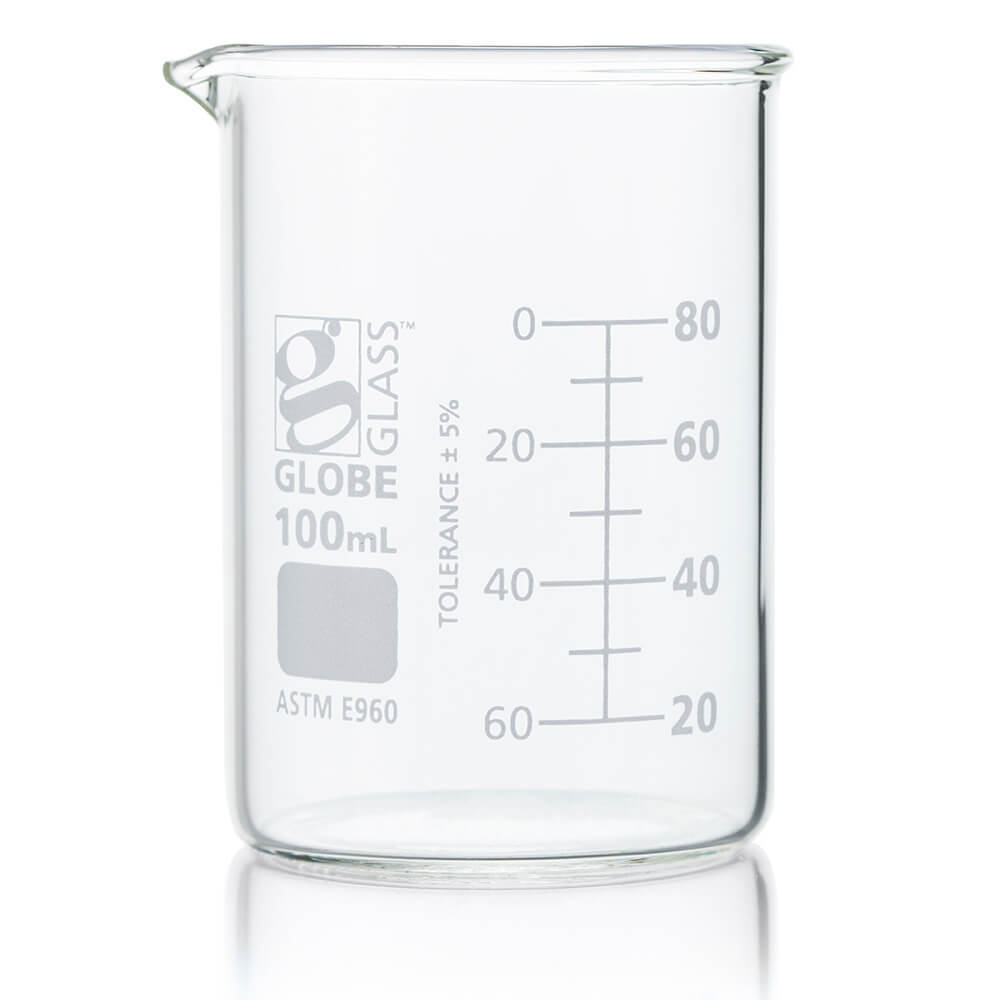 Beaker, Globe Glass, 100mL, Low Form Griffin Style, Dual Graduations, ASTM E960, 12/Box