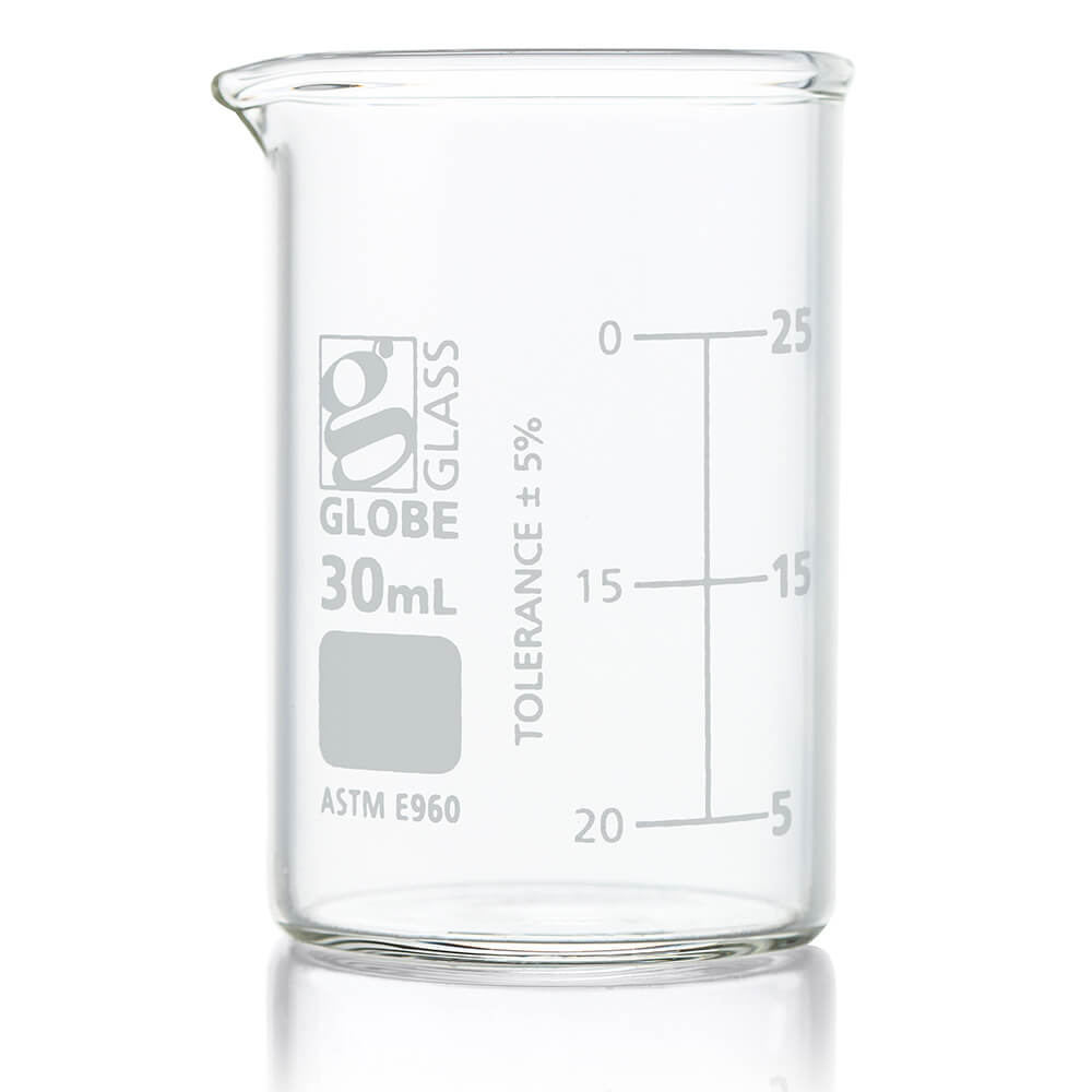 Beaker, Globe Glass, 30mL, Low Form Griffin Style, Dual Graduations, ASTM E960, 12/Box