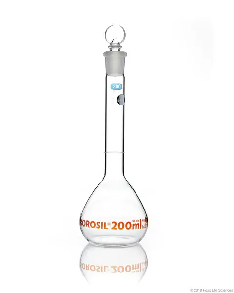 Borosil® Wide Mouth Class A Volumetric Flasks with Interchangeable Solid Glass Pennyhead Stopper (19/26), Batch Certificate, 200 mL, 10/CS