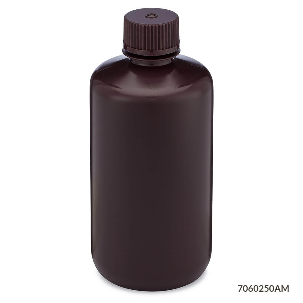 Bottle, Narrow Mouth, HDPE Bottle, Attached PP Screw Cap, Amber, 250mL, 12/Pack