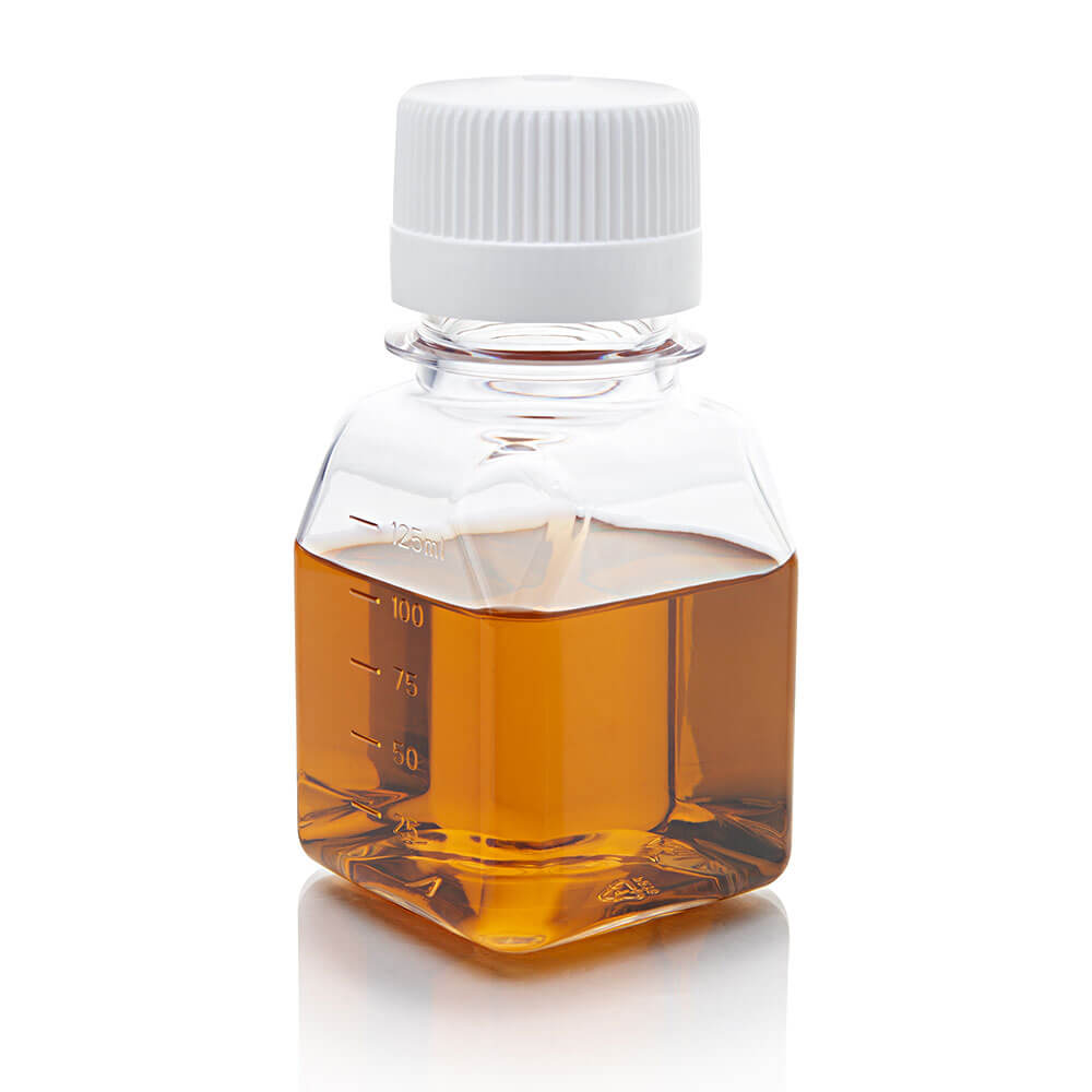 Bottle, Square Media, PETG with HDPE Closure, 125mL, STERILE with Tamper Evident Shrink Band, 24/Shrink Wrapped Tray, 48/Case