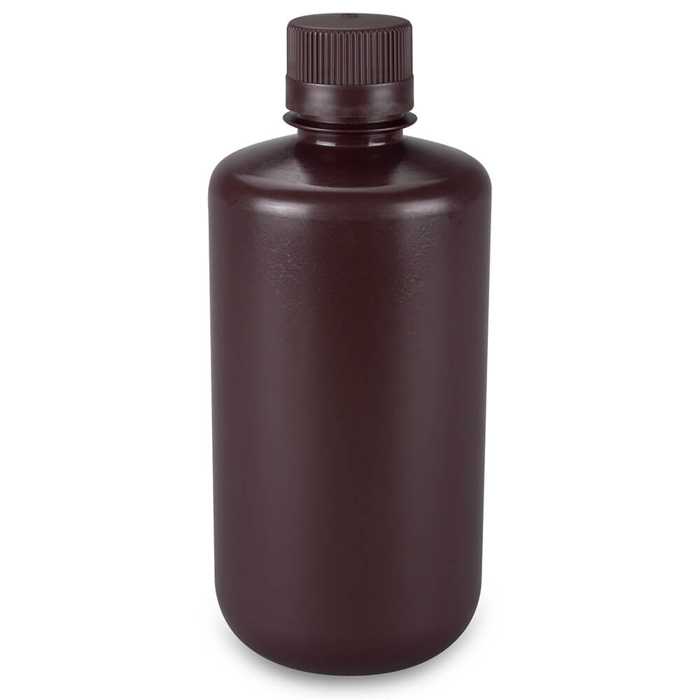 Bottle, Narrow Mouth, Boston Round, Amber HDPE with Amber PP Closure, 1000mL, Bulk Packed with Bottles and Caps Bagged Separately, 50/Case