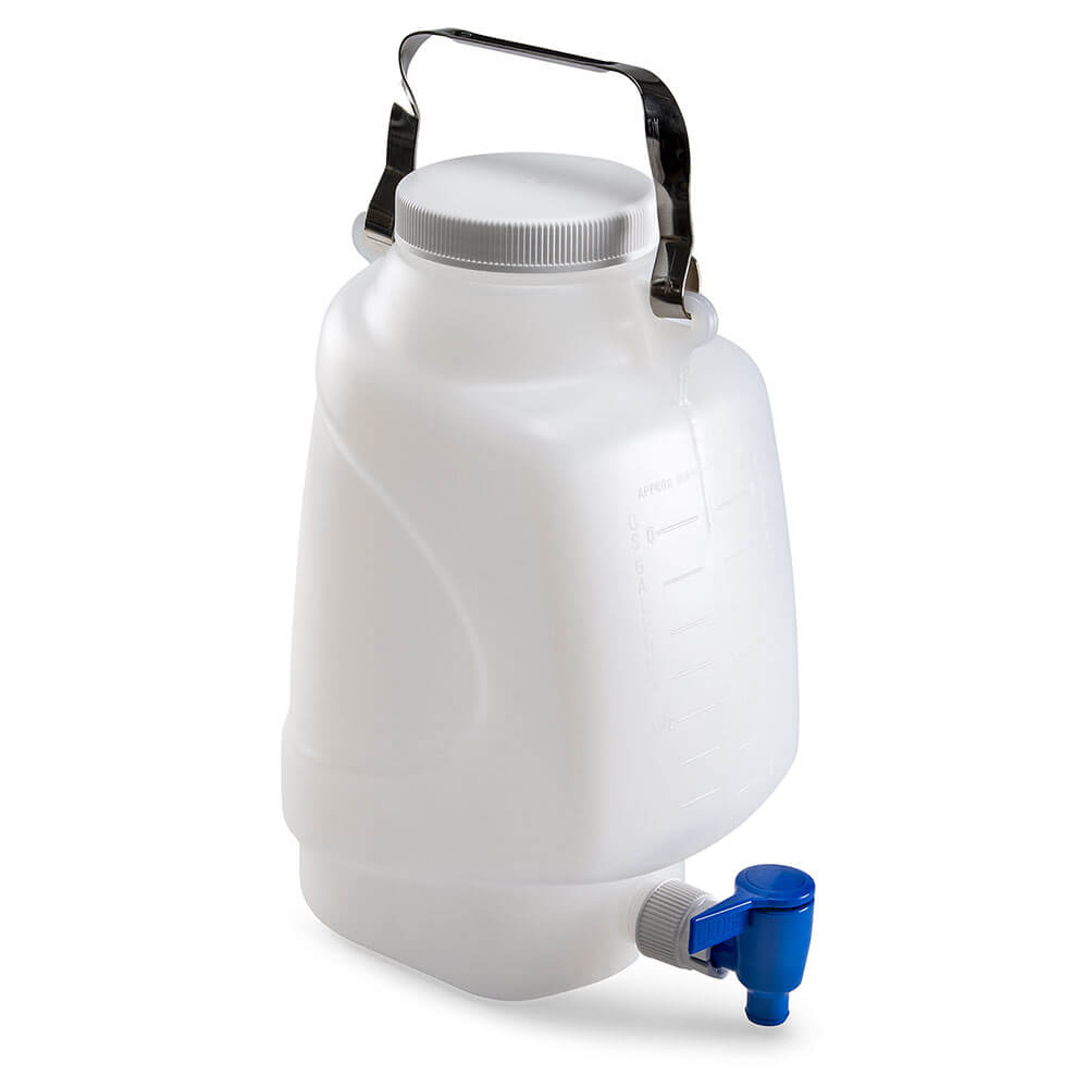 Carboy, Rectangular with Spigot and Handle, HDPE, White PP Screwcap, 5 Liter, Molded Graduations
