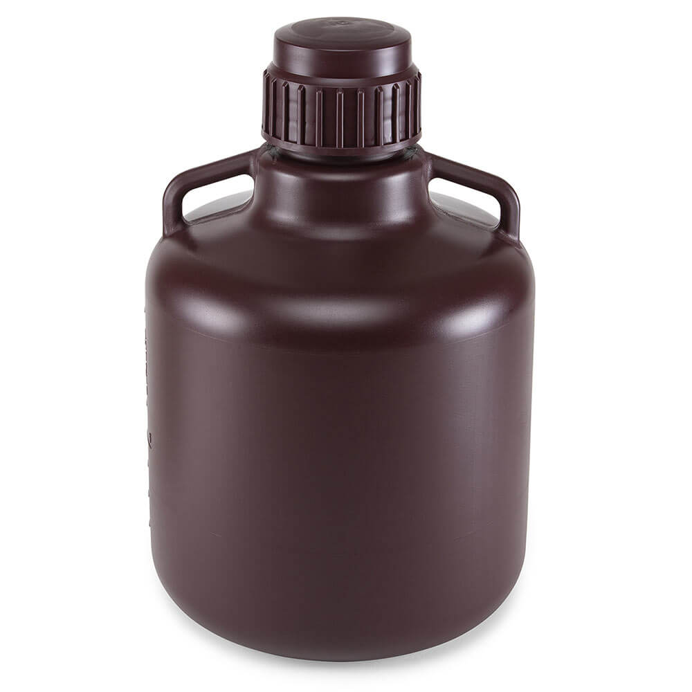 Carboy, Round with Handles, Amber HDPE, Amber PP Screwcap, 10 Liter, Molded Graduations, Autoclavable