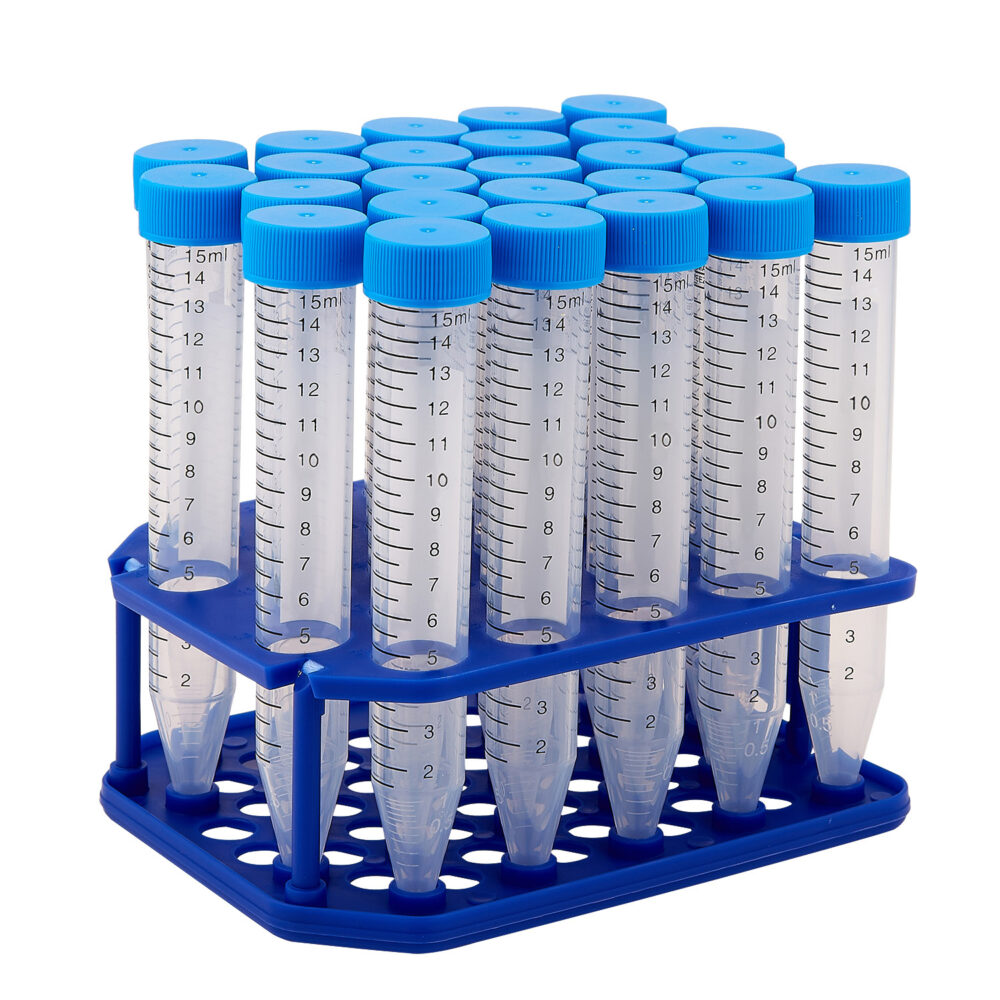 Conical centrifuge tubes are made of premium polypropylene for clarity and centrifugal strength. Tubes and caps may be frozen at temperatures as low as -86˚C. The maximum centrifugal force is 12,000xg for the 15ml tubes and 15,000xg for the 50 ml tubes*. Caps have a flat top surface for easy marking and labeling. Cat. No. C2605 features a ‘skirted’ bottom that allows the tube to stand upright without a separate test tube rack. C2607 and C2608 ship in Eco-Plastic racks, a recyclable alternative to standard foam racks when it’s time for disposal, or can be broken down into a compact, flat package that is easy to store between uses.