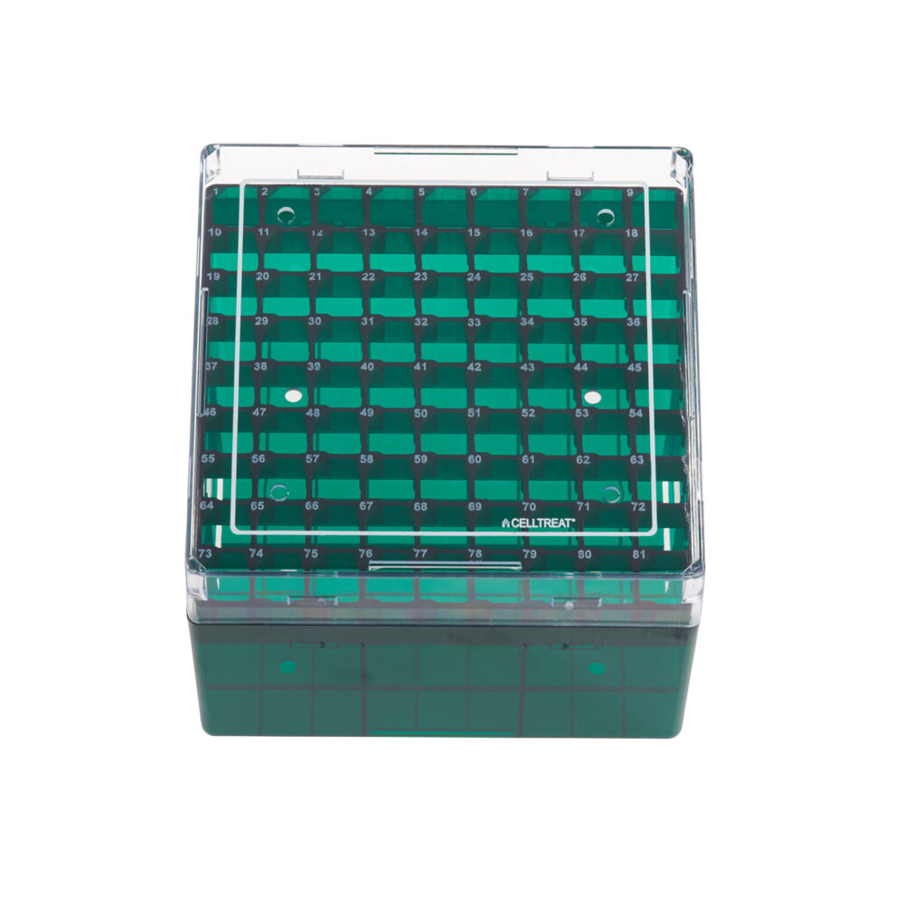 CELLTREAT Freeze Cryogenic Vial Storage Boxes are made from durable polycarbonate material designed to withstand a wide temperature range and is a reusable, autoclavable alternative to disposable racks Ventilation holes in the lids and bases prevent vacuum sealing in freezer Storage Boxes are labeled with numeric markings on the base of the box for easy identification of individual positions, with or without the lid