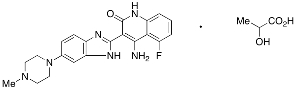 SMILES: CN1CCN(CC1)c2ccc3nc([nH]c3c2)C4=C(N)c5c(F)cccc5NC4=O Purity: