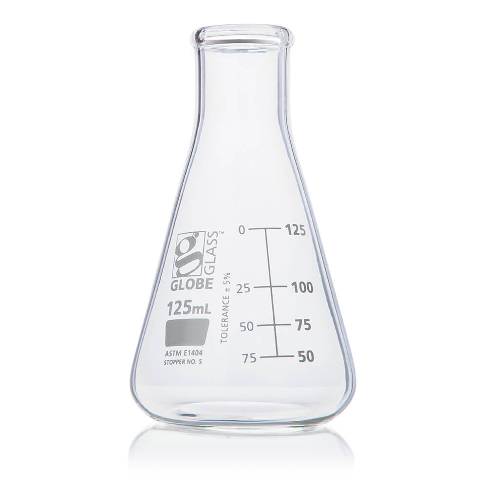 Flask, Erlenmeyer, Globe Glass, 125mL, Narrow Mouth, Dual Graduations, ASTM E1404, 12/Box