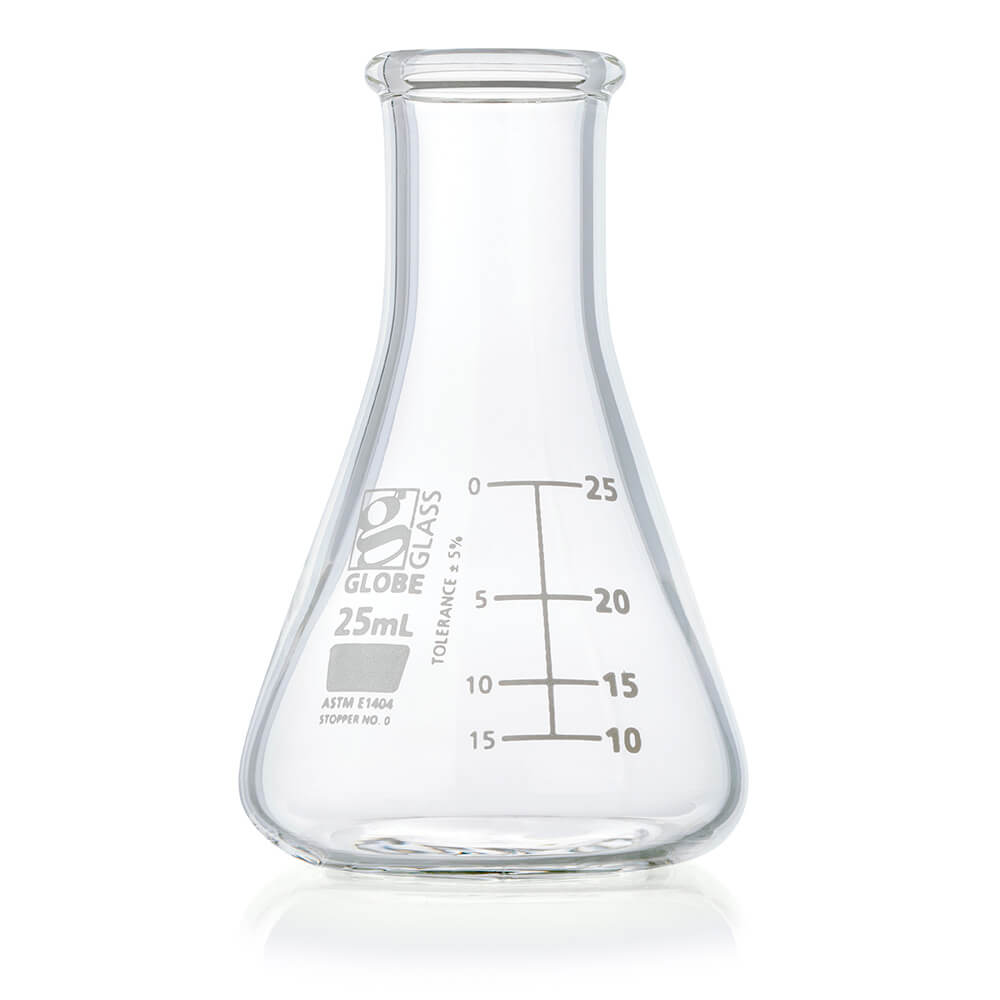 Flask, Erlenmeyer, Globe Glass, 25mL, Narrow Mouth, Dual Graduations, ASTM E1404, 12/Box