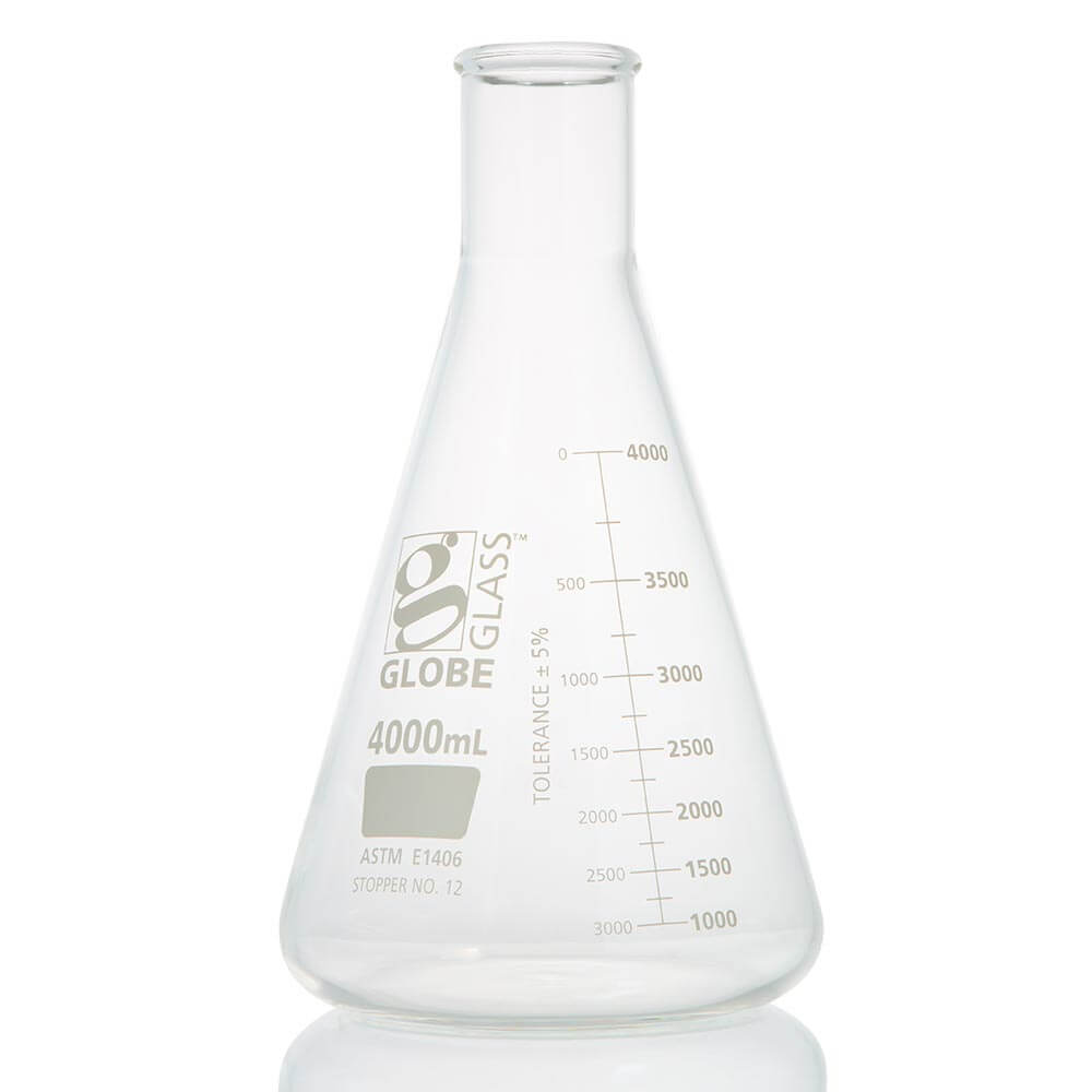 Flask, Erlenmeyer, Globe Glass, 4000mL, Heavy Duty, Narrow Mouth, Dual Graduations, ASTM E1406, 1/Box