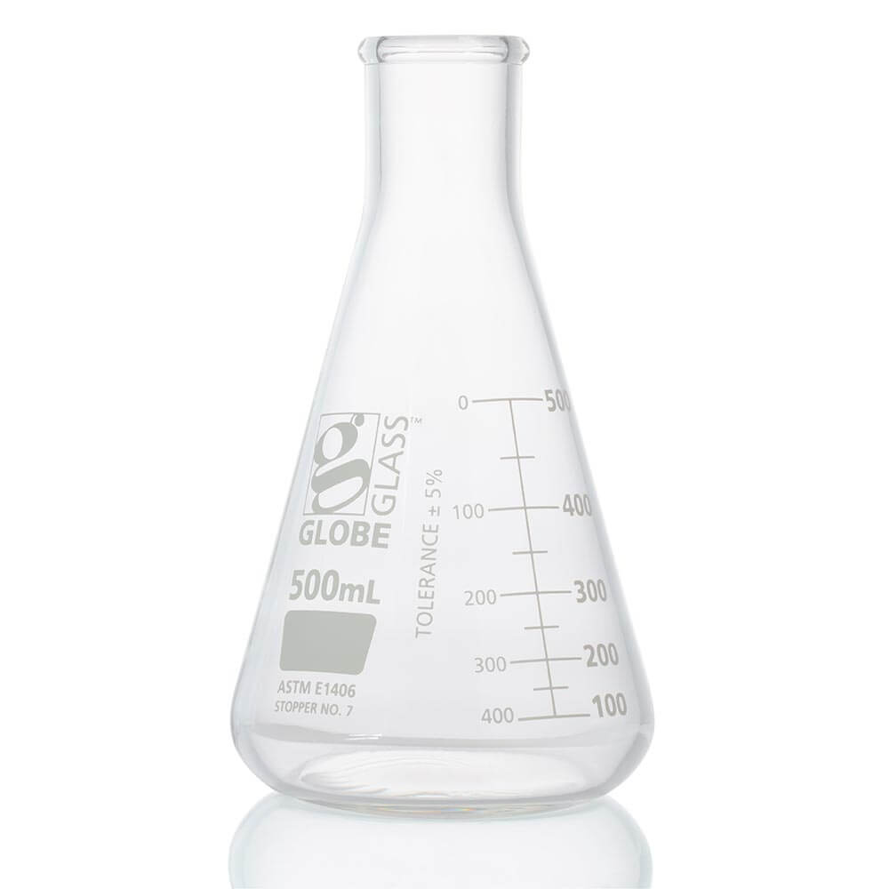 Flask, Erlenmeyer, Globe Glass, 500mL, Heavy Duty, Narrow Mouth, Dual Graduations, ASTM E1406, 1/Box