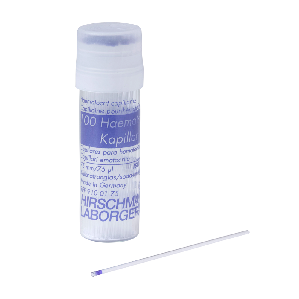 Disposable micro-hematocrit capillaries for centrifuging blood samples, not heparinized, with LOT number on packaging, labelled with: usable until, DIN EN ISO 12772, CE pursuant to IVD 98/79 EC.