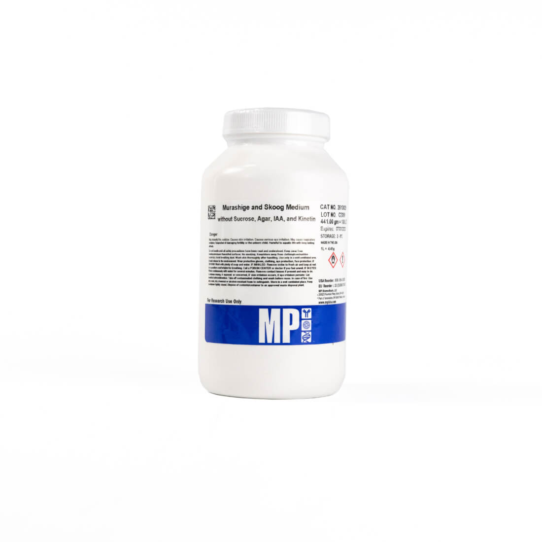 Murashige and Skoog Medium contains Murashige and Skoog salts, as well as a mixture of vitamins. This modification of the original formula does not contain agar, sucrose, IAA, and Kinetin. Murashige and Skoog Medium is widely used plant tissue culture growth medium. It has proven effective in the culture of tissue derived from moncotyledons and dicotyledons. This medium, originally formulated to support tobacco callus, has been used to support callus initiation and growth, the growth of cells in suspension culture and the regeneration of shoots and plantlets from explants. More recently, it has been used for micropropagation of ornamental, vegetable and fruit plants in research and commercial enterprises.