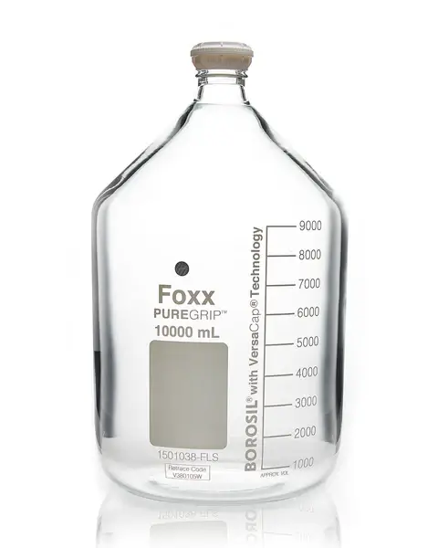 PUREGRIP® Reusable Round Glass Media Storage Bottles with GL45 VersaCap, Pouring Ring, and Extra Large Marking Spot, 10 L (10,000 mL), 1/EA