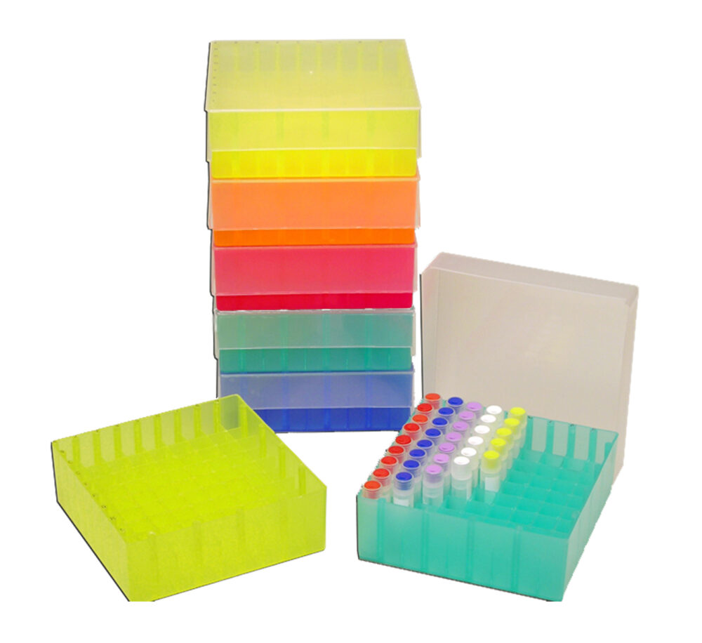 Suitable for refrigerator and freezer storage as low as -80˚C, these boxes have translucent lids and numbered cavities. No. R1010 is a PCR workstation rack/box for 96x 0.2ml (plates, strips or individual tubes). No. R1020 is a 10×10 format with an attached hinged lid. No. R1060 is the standard 9×9 format with a friction fit lid.