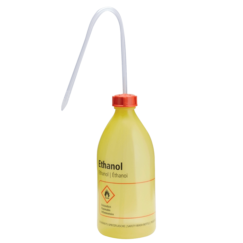 Safety wash bottle, PE-LD, complete with screw cap and spray tube, yellow transparent, contents label in German, English, French and Spanish, hazard symbols and hazard indications pursuant to the German Ordinance on Hazardous Substances (Gefahrstoffverordnung).