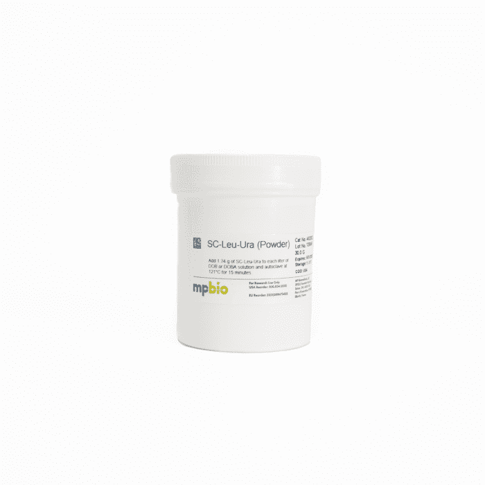 Double dropout formulation (without L-Leucine and Uracil) of Synthetic Complete Supplement Mixture (SC) of amino acids for S. cerevisiae growth media. Also known as Hopkins Mixture and is available in complete and dropout formulations.