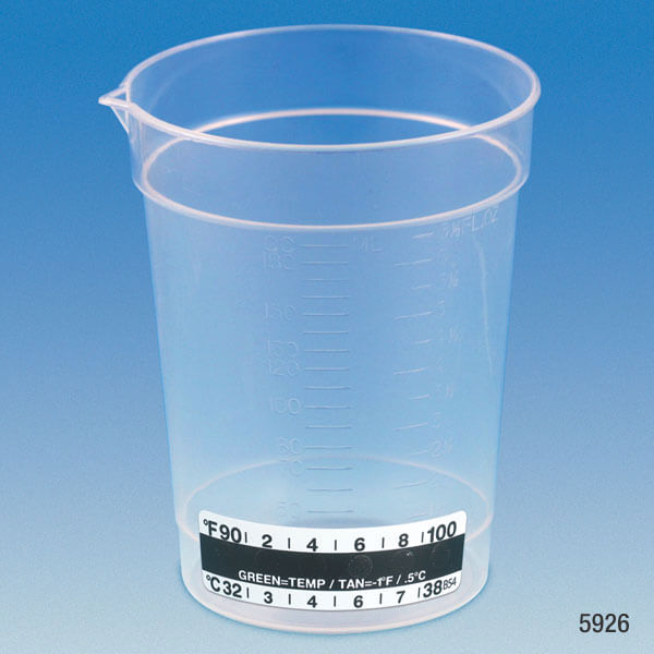 Specimen Container, 6.5oz, with Attached Thermometer Strip, Pour Spout, PP, Graduated