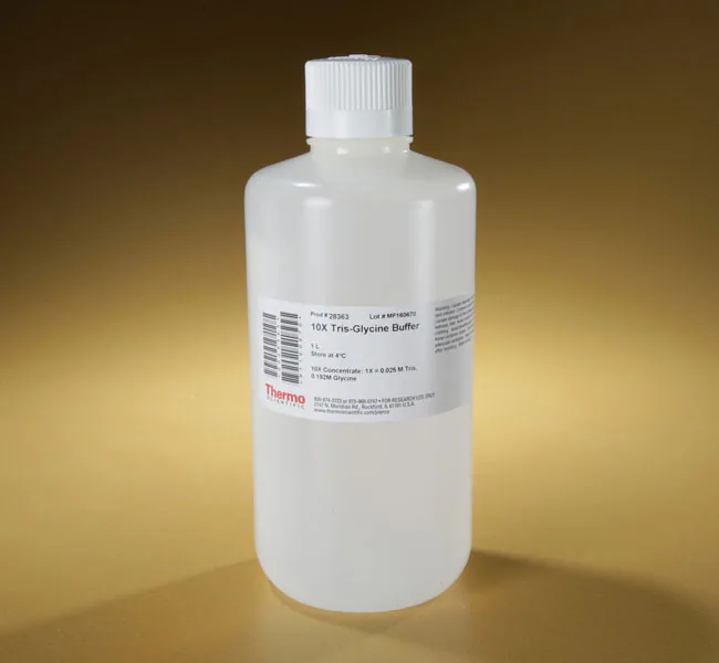 10X Tris-Glycine Buffer is a space-saving stock solution that is ideal for quickly preparing standard Tris-glycine (pH 8.5) transfer buffer used for western blotting using Tris-glycine gel electrophoresis. When diluted 10-fold in water or 20% methanol, the solution yields 0.025 M Tris, 0.192 M glycine at pH 8.5.