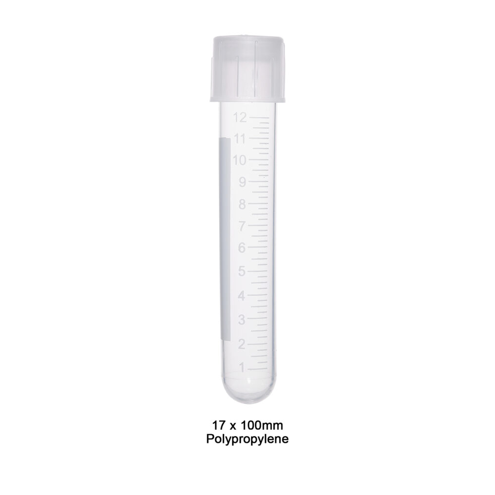 These disposable sterile tubes are made of high quality polypropylene (PP) plastic that will withstand temperatures from -190˚ to +120˚C. They are also available in crystal clear polystyrene (PS) with a range of 0˚ to 70˚C. Caps are made of polyethylene (PE) and have the popular two position design (up/loose for aerobic work and down/sealed for anaerobic cultures). Polystyrene tubes may be centrifuged at up to 2000xg. Polypropylene tubes withstand higher forces, up to 4000xg.